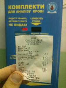 В первой городской больнице ему предложили в специальном автомате купить комплект для анализа стоимостью 20 гривен. Зайдя в аптеку на первом этаже он приобрел обычный комплект со скарификатором и перчатками за 5 гривен.
