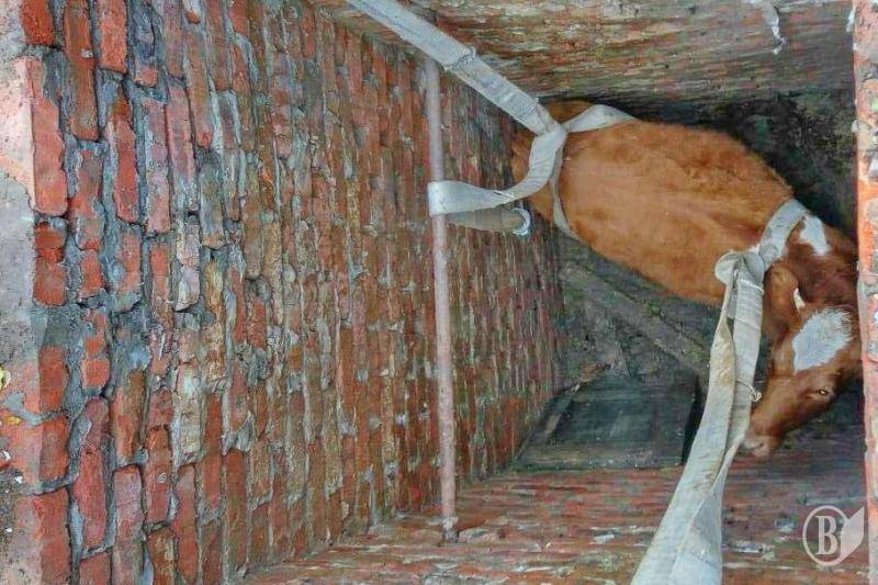 Аби не зашкодити худобі під час її вивільнення, рятувальники за допомогою спецінструменту спочатку обрізали у каналізаційній шахті металеву трубу, що заважала проведенню невідкладних робіт, а потім один з рятувальників спустився до тварини, обв’язав її пожежними рукавами і закріпив трос.