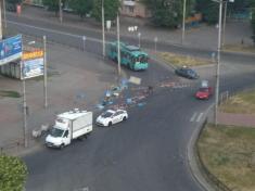 Сьогодні вранці близько 06:50 в районі Кругу з вантажного автомобіля прямо на проїжджу частину випало близько десяти ящиків із м’ясом та м’ясною продукцією.