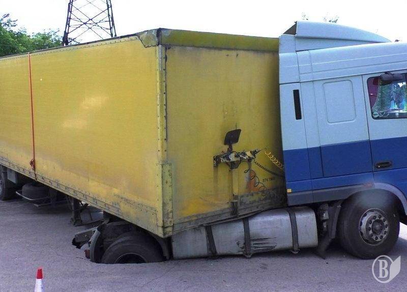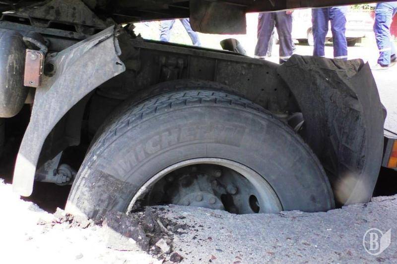 І правильно: сталося не дуже добре: тягач провалився по самі вісі під асфальт.