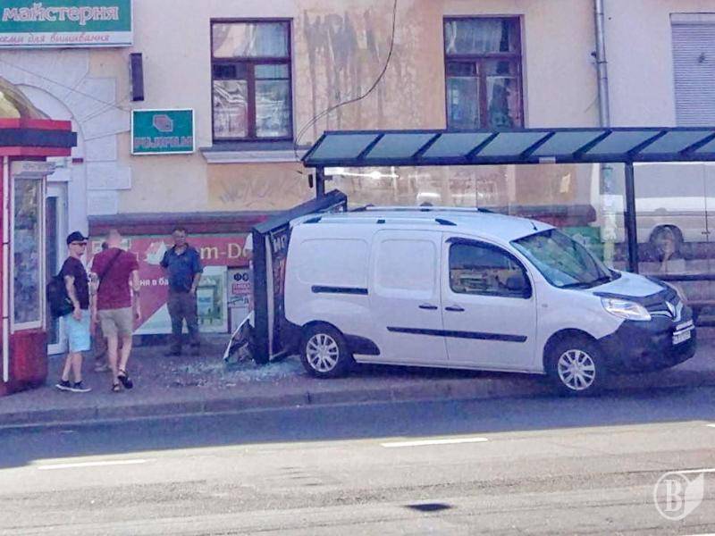 В Чернігові на перехресті центральних проспектів Миру та Перемоги вантажний фургончик заїхав на зупинку громадського транспорту й розбив новий модний і дорогий скляний навіс.