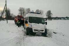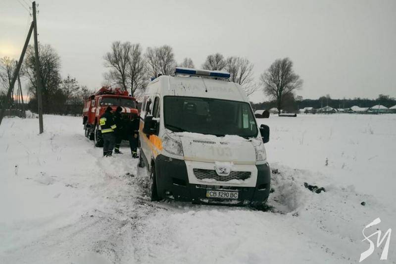 До місця пригоди прибуло відділення 12-ї державної пожежно-рятувальної частини УДСНС України у Чернігівській області. Рятувальники за допомогою буксирувального тросу вивільнили із снігового замету автомобіль швидкої допомоги, але дорога була переметена і далі автомобіль бригади медиків рухатися не міг.