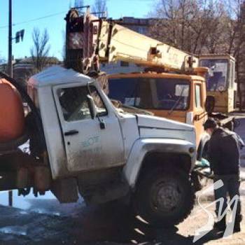 У Чернігові на вул. Івана Мазепи 12 березня автокран КС-4572 на шасі вантажівки «КамАЗ» розбив своєю стрілою з гаком кабіну лайновоза на шасі «ГАЗ» із держномером СВ0998АН.