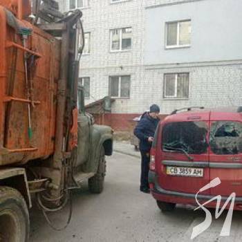 В Чернігові сміттєвоз завдав шкоди легковику під час зіткнення в одному з дворів багатоповерхівки.