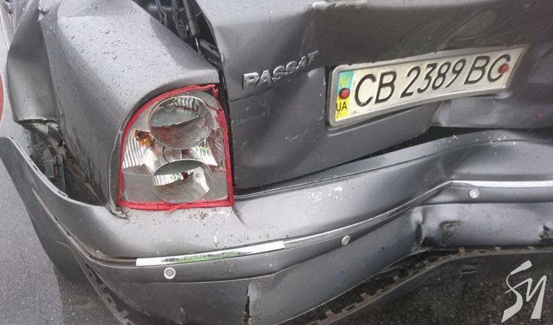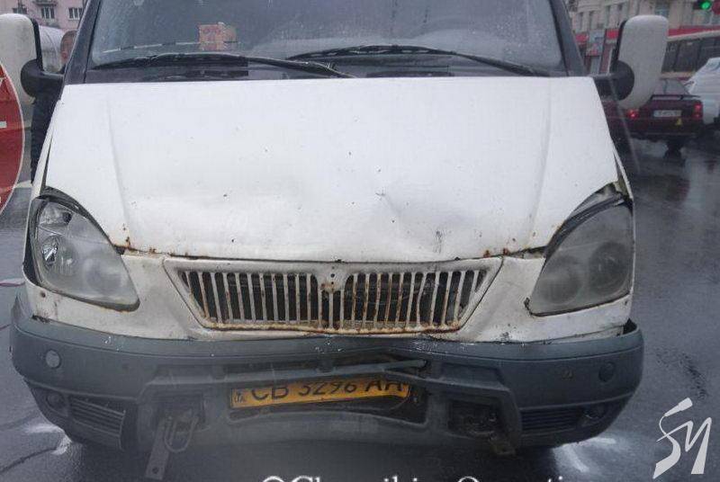 Сьогодні на перехресті проспектів у Чернігові «газелеподібна» іржава маршрутка Рута-20 СПВ вдарила в корму легковик Volkswagen Passat.