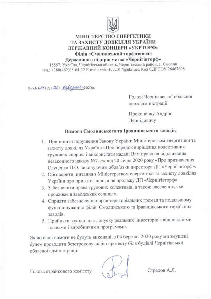 -Припинити порушення Закону України Міністерством енергетики та захисту довкілля України «Про порядок вирішення колективних трудових спорів» і використати надані Вам права на відкликання незаконного наказу №7-к/к від 20 січня 2020 року «Про призначення Слуценка П.О. виконуючим обов’язки директора ДП «Чернігівторф».