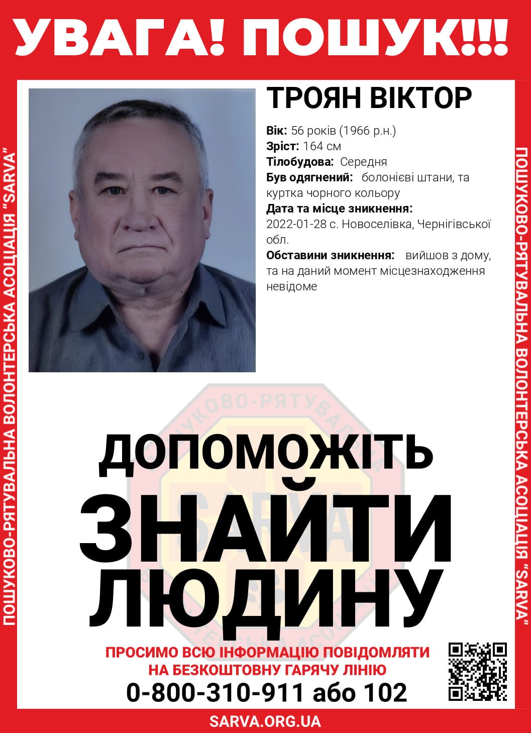 У Чернігові розшукують 56-річного Віктора Трояна. Він 28 січня вийшов з дому та до нині не повернувся. Місцезнаходження його невідоме.