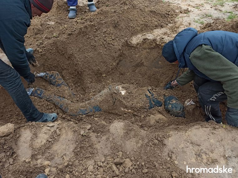 На одному — могила місцевого жителя Віктора Шевченка. «Він убитий росіянами пострілом у голову. На фото видно. І похований на його ж городі біля його оселі. Це відбулося в період, коли всіх зганяли в підвал школи. Як кажуть місцеві жителі, його вбили через те, що він мав вдома зброю — мисливську рушницю. Також він часто носив бушлат з камуфляжем. Можливо, був одягнений у це й на момент, коли його побачили окупанти», — розповідає Віталій.