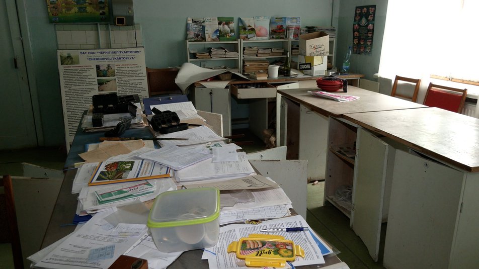 У лабораторії селекції розкидали матеріали та документацію. У приймальні – вибили двері, повиривали кабелі, забрали оргтехніку, зламали сейф. За словами Гайструка, там зберігалася документація, сертифікати на сорти, документи на техніку.