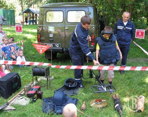 Об опасных находках, которые остались в земле на поприщах области ещё со времен Великой Отечественной войны, рассказали специалисты пиротехнической группы Главного управления МЧС в области. Дети ознакомились с макетами снарядов, мин, гранат, и как необходимо действовать в случае их выявления. Бронежилеты, каски, приборы выявления опасных предметов, - на это малышня не только посмотрела, но и имела возможность примерять на себя и почувствовать "тяжесть" работы настоящего пиротехника.