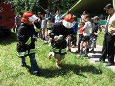 Следующий этап - пожарная эстафета. Наистаршие подростки соревновались на скорость в одевании боевой одежды и прокладке рукавной линии от пожарного автомобиля.