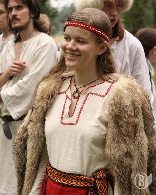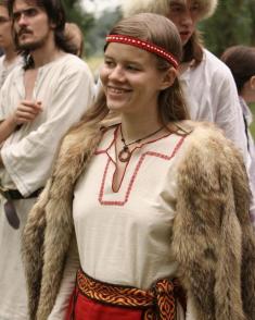Мы приехали с самого утра, как раз перед началом официального открытия. Громко звучат баллады, отдыхают после ночного празднования участники действа. Подумать только, а все вокруг и в самом деле напоминает средневековье! Вот и настоящие островерхие палатки, в которых когда-то отдыхали рыцари неподалеку от поля боя, и посуда глиняная и деревянная, и мехом вымощенная постель. Не вдалеке от палатки встречаю девушку – босую, в полотняной вышитой рубашке, сверху – накидка из меха, распущенные волосы. Костюм чрезвычайно интересен, поэтому я попросила девушку рассказать о нем.