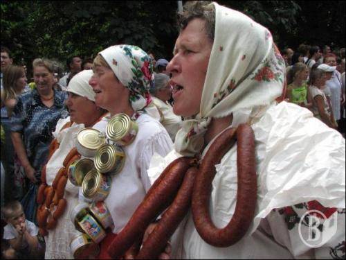 Женщины из села Свердловка сделали ожерелье из колбасы, сосисок, жестянок с тушонкой местного мясокомбината (фото: Виталий ЛИТВИН)