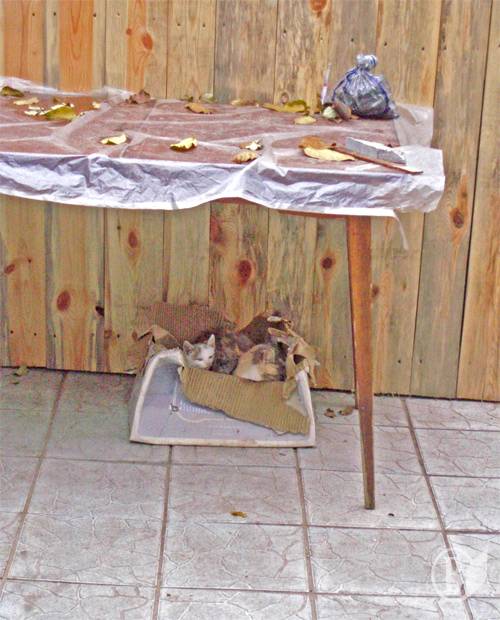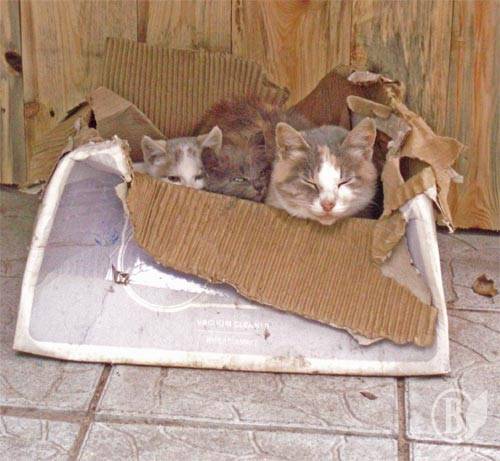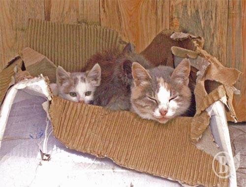 Для мурки-мамы, Дымка-сына и Пушинки-дочки наступили неприятные времена. Холодно стало! Доходит до заморозков. Пока ещё семью устраивает картонная коробка возле сарая.
