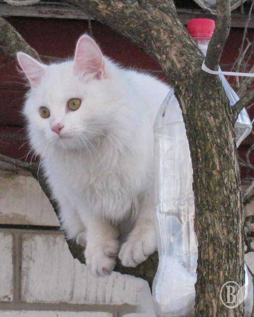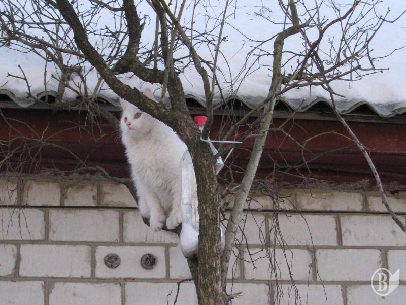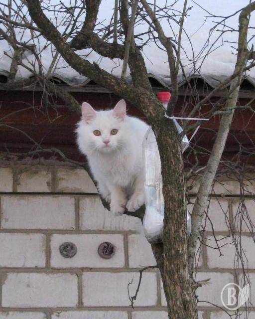 В это время беленькое и пушистое существо на дереве – кот или кошка – сидит неподалёку и смотрит на мир своими широкими зелёными глазами. Боится покинуть дерево – свой стратегический пункт, откуда всё видно.