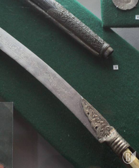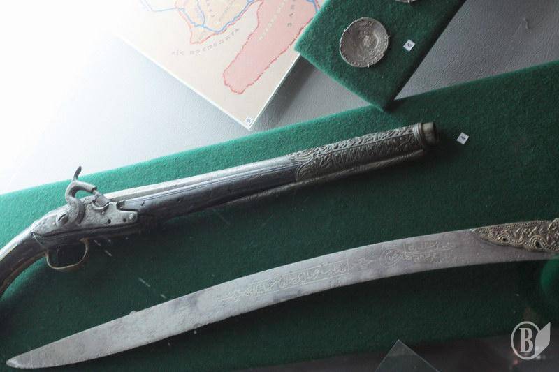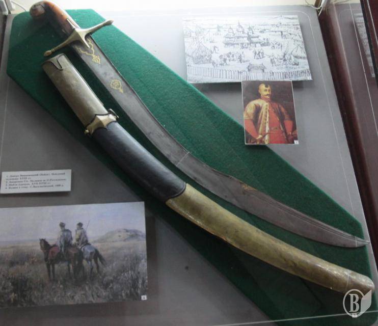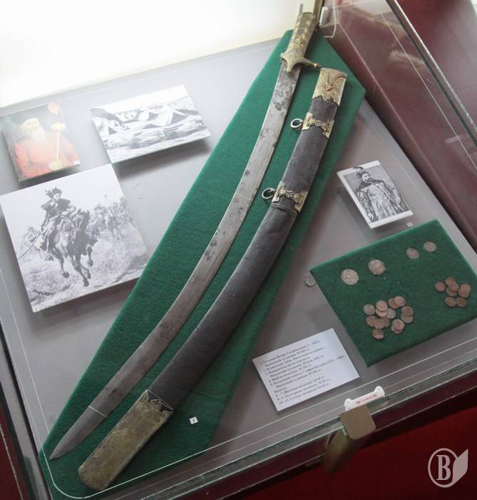 Представлены оригинальные образцы казацкого оружия (турецкие и польские сабли, ятаганы), пистолеты казацкой поры.
