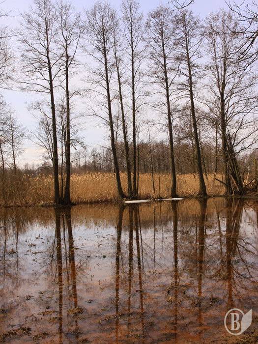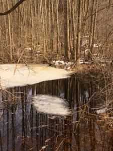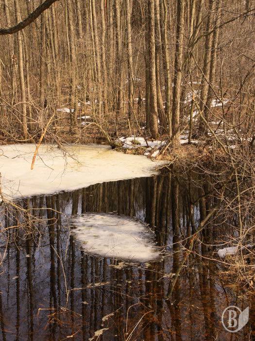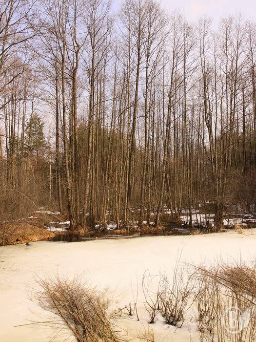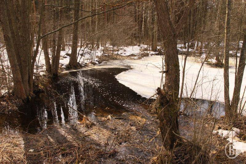 Снег и лёд, как остатки зимы, ещё прячутся, прикрытые лесом.