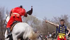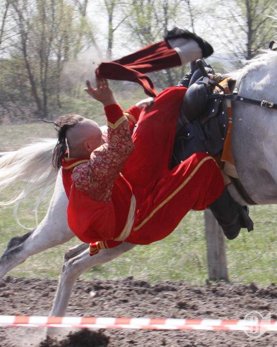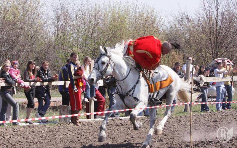 Участники праздника, казаки, продемонстрировали своё мастерство во владении саблей, копьём, кнутом. Показали казацкое мастерство в поднятие предметов с земли на скаку.