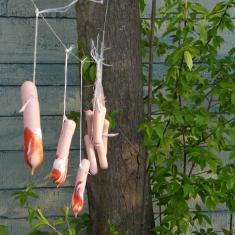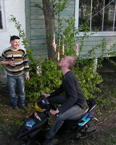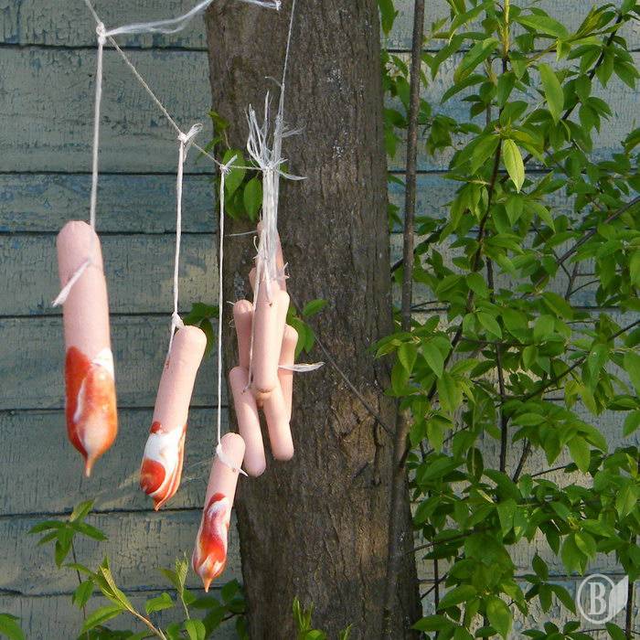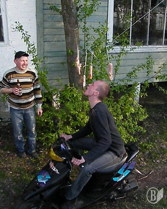Многим особенно понравился конкурс «кровавая сосиска». Его условие – откусить на ходу подвешенную на веревке сосиску. Чтобы конкурс выглядел действительно «смачно», этот «спортивный снаряд» щедро намазывался майонезом и кетчупом.