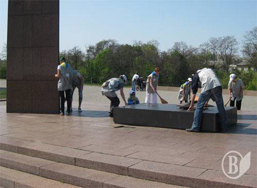 Зелена молодь завбачливо прихопила з собою на прибирання не лише пакети для сміття, а й сапки, віники, фарбу ( для огорож поховань), щіточки та, навіть, розчинники. Останніми витирали різні написи і знаки на монументі Невідомому солдату.