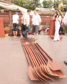 Красные бунгало должны оставаться по правую сторону борта, а белые слева. Именно они указывают, где самое глубокое дно. Чтобы их разглядеть издали, нужно иметь замечательное зрение. Не разглядел — и вот мы попали на мель. Для лодки это экстренная ситуация, действовать придётся решительно. Раздаются чёткие команды: «Правый борт, табань! Левый, вперёд! Правый борт, суши вёсла! Левый, вёсла на воду! Правый, вёсла на воду! Вперёд!». Для такой координации действий нужно иметь хорошую реакцию и умение. И вот мы опять на воде.