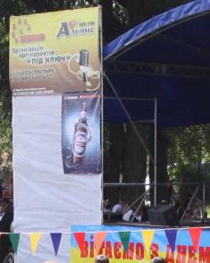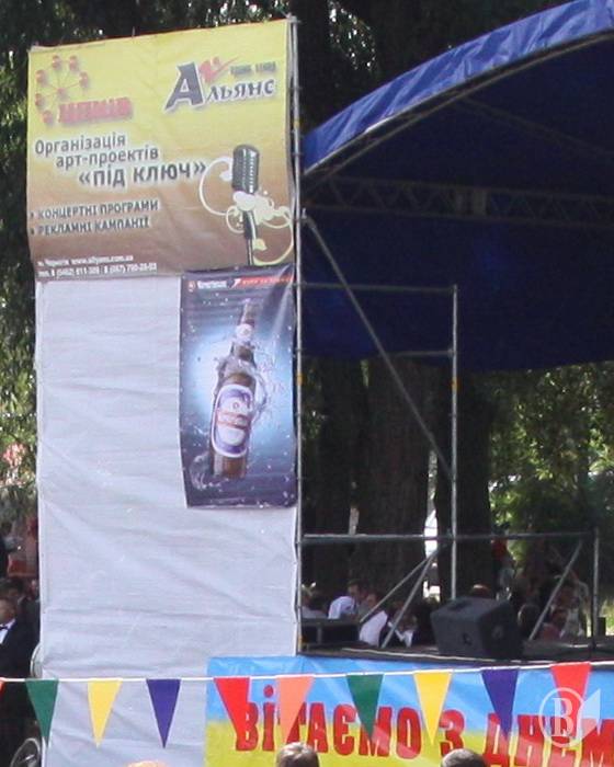 На территории парка КУЛЬТУРЫ была установленная сцена, обильно украшенная рекламой ПИВА. Бутылка слева, стакан с желтой жидкостью справа, а в придачу – плакат по центру. При этом на сцене выступали дети и подростки.