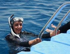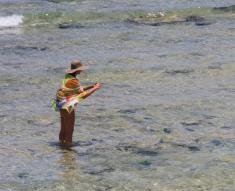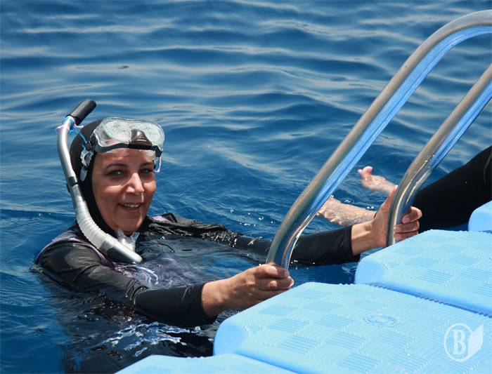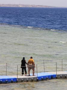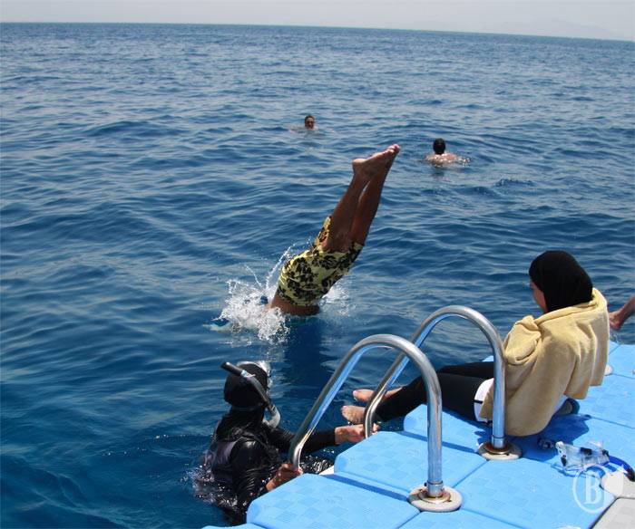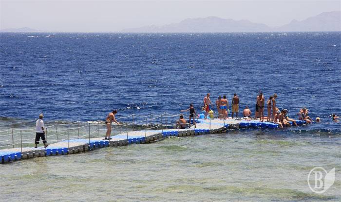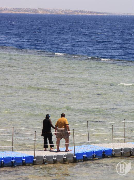А на кораловому пляжі без спеціальних мокасинів ходити не можна – миттю поріжеш ноги. Коли перший день нашого приїзду штормило – ми тільки помочили ноги на мілині. На понтон нас не пускали рятувальники – вивісили червоний прапор і свистіли, щойно хтось заходив на понтон чи підбирався до закінчення мілини, після якої, власне, і починається краса і… 18-метрова глибина.