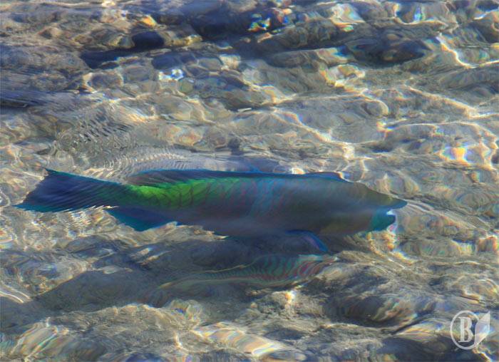 Тож довелося мокнути у воді біля берега – миттю обрізав руки, якими тримався за уступи мертвих коралів, щоб не носило хвилею. Зате які риби поруч! І яскраво-зелені, і полосаті всіх форм, і помаранчеві, і чорно-жовті, і бірюзові.
