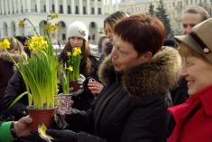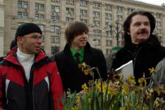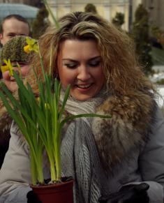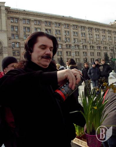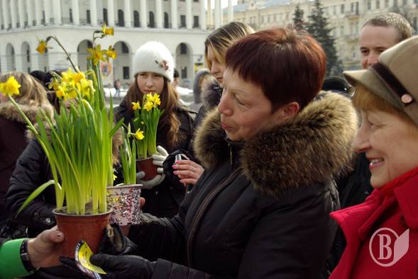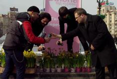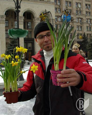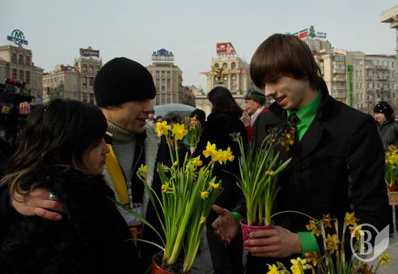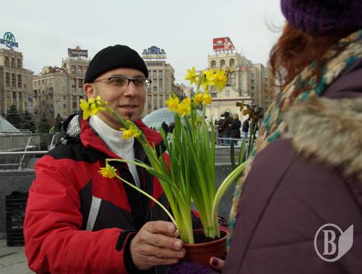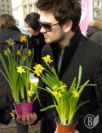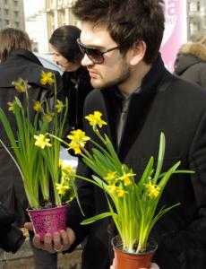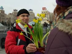 На Площади Независимости они дарили женщинам цветы – нарциссы – в горшках. Женщинам дали выбор – обычный натуральный цветок или покрытая «смолой» в виде черной краски из баллончика.