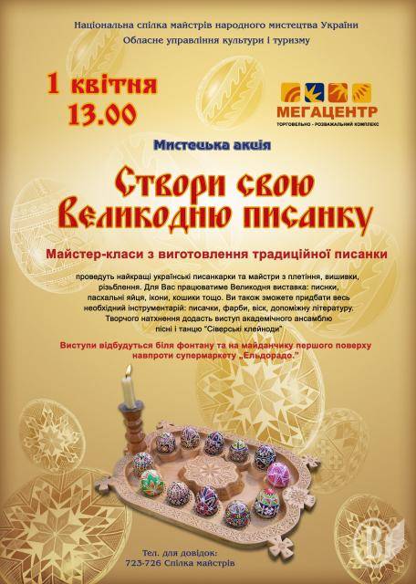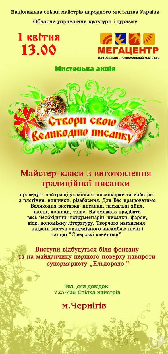 1 квітня в чернігівському «Мегацентрі» відбудеться передсвяткова акція: майстер-клас з традиційного писанкарства „Створи свою Великодню писанку”.