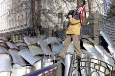 Березень, 2001 р. Тарас Процюк знімає на Банковій біля Адміністрації Президента. Фото Сергія Каразія