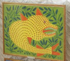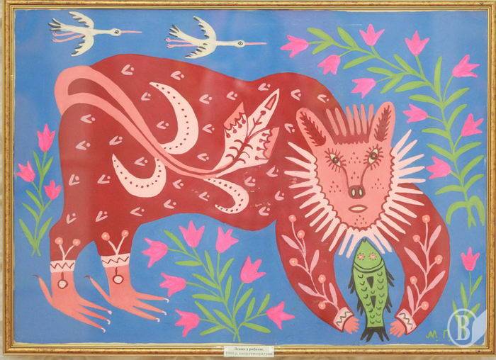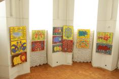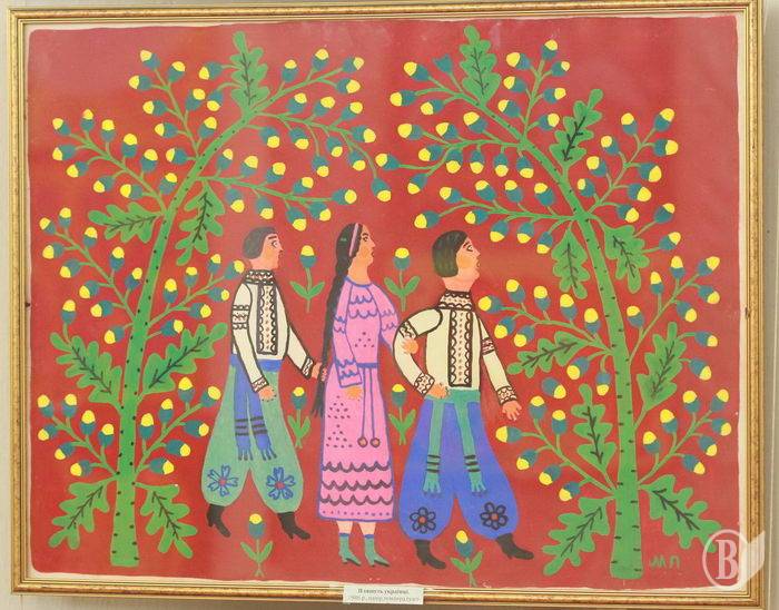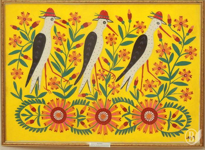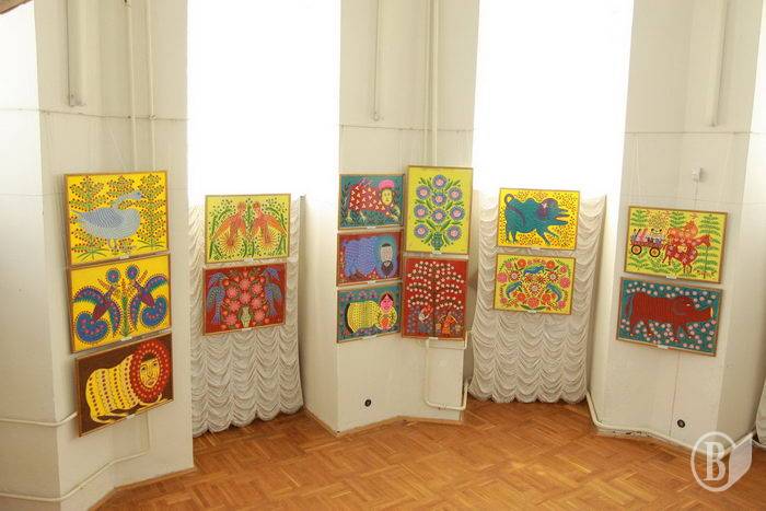 У виставковій залі Колегіуму представлено 40 робіт всесвітньовідомої майстрині. Серед них: «Весілля» (1986), «Стародавній їжачок» (1987), «Поліська красуня» (1995), «Пан Коцький» (1987), «Пляшуть українці» (1986), «Йшов кум до куми» (1988), «Унадився журавель» (1986), «Український бичок» (1987), «Папуга у квітах» (1985).