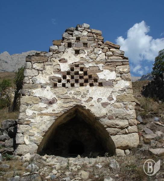 склеп горного аула Верхний Оздик. Раньше ингуши своих покойников не хоронили в землю, а клали в склепы. Этот мумифицированный скелет принадлежит, скорее всего, человеку, который умер во время эпидемии холеры в 1901-1903 годах