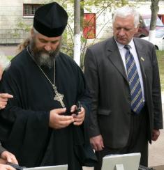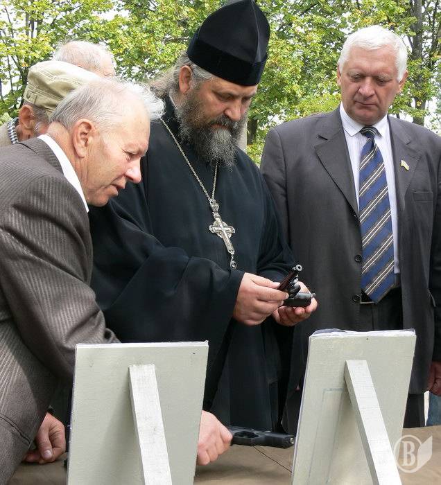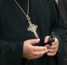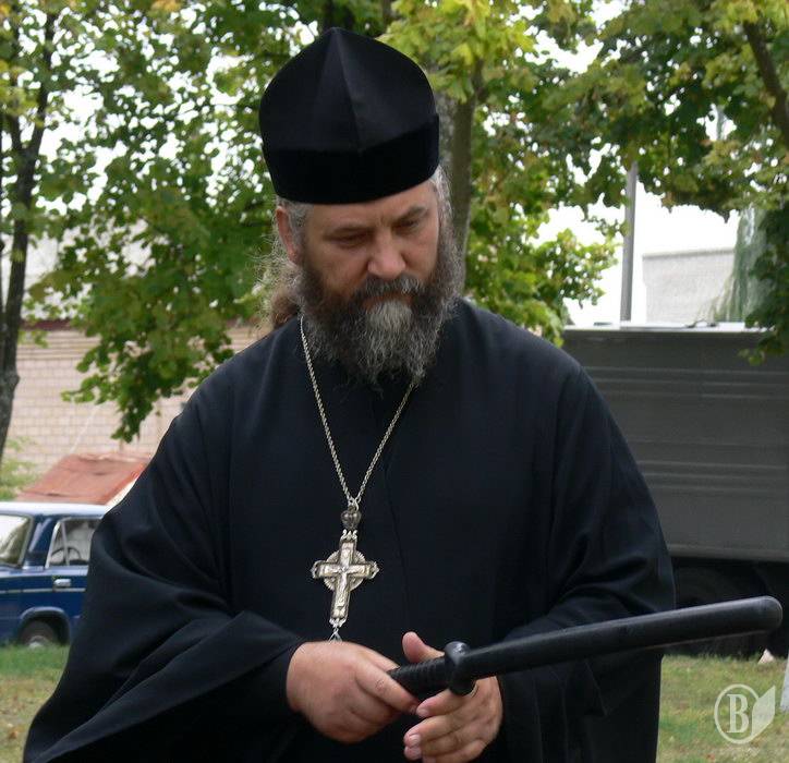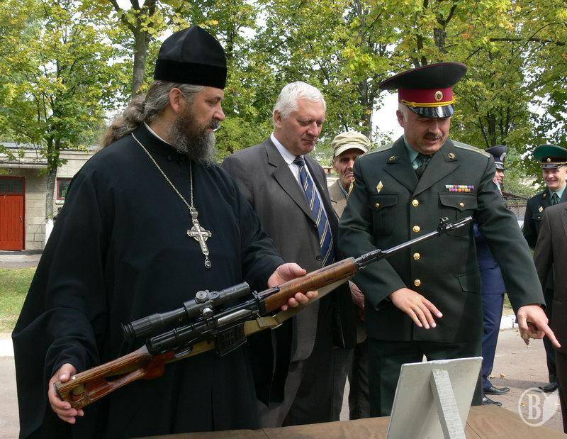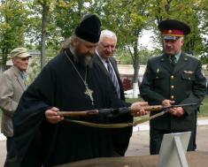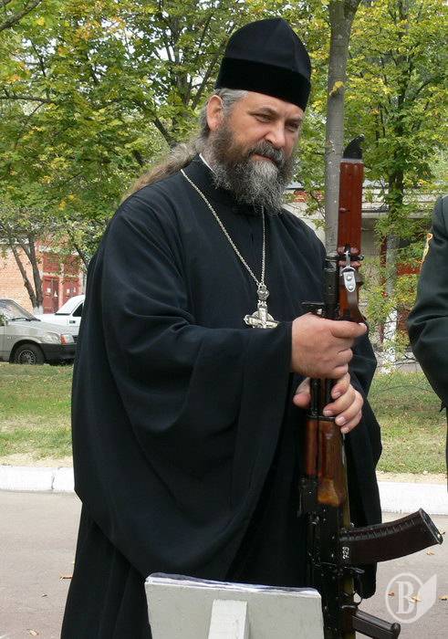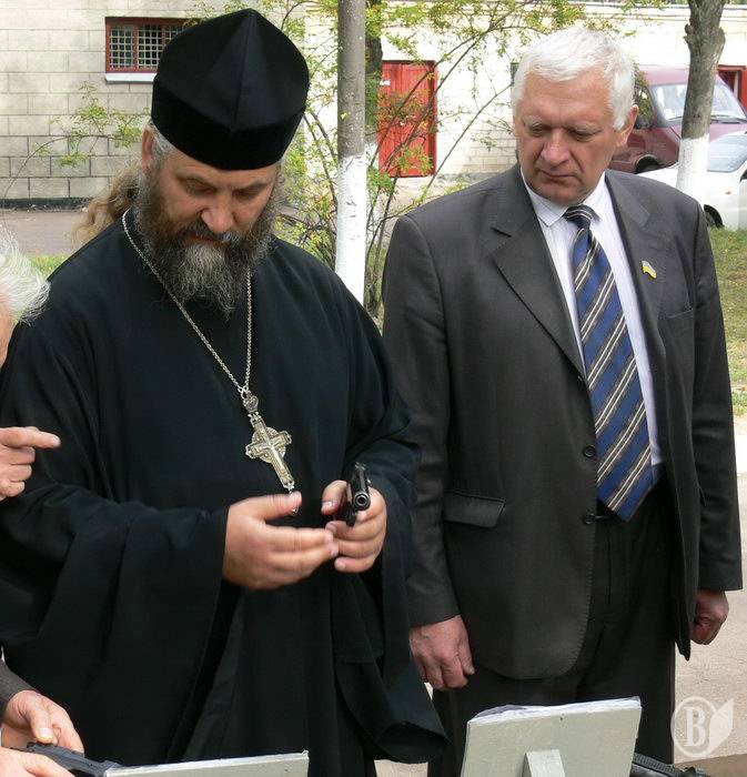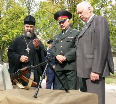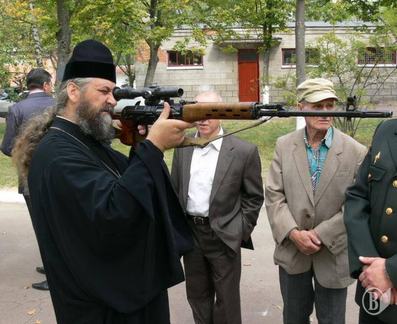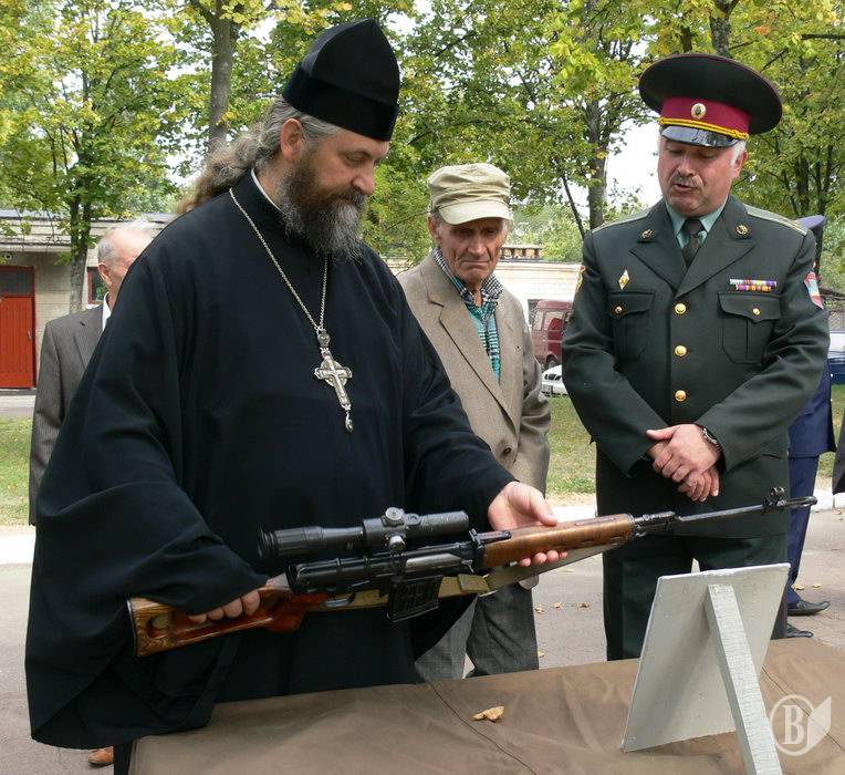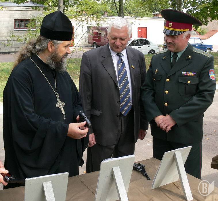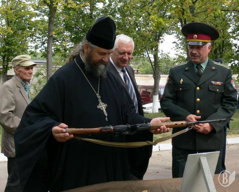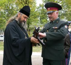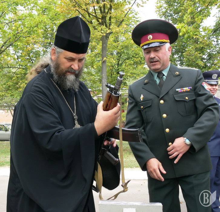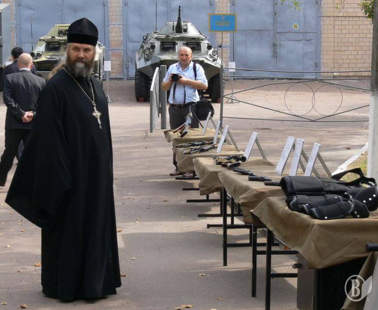Під час відзначення 90-річчя з дня створення батальйону внутрішніх військ МВС України 3001 один з гостей – отець Федір – знайомився зі зразками різного виду зброї.
