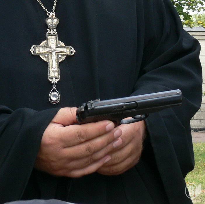 Его наверное пригласили освятить оружие - это теперь модно - а он не сдержался - начал играться! ))))))))))