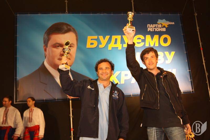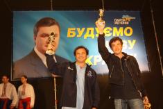 На сцені біля облмуздрамтеатру красувався великий портрет Януковича з його юлюбленим гаслом останнього часу "Будуємо нову країну".