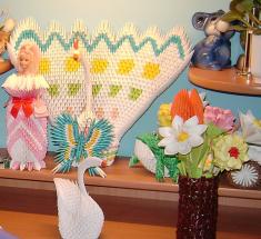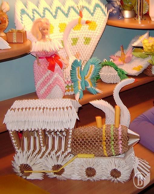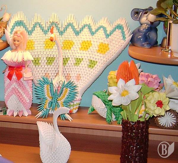 – Десь день, – каже Аліна. – Інструменти прості – олівець, лінійка і ножиці. Папір купуємо у магазинах і на базарі. Нас уже всі продавці цього товару знають, то, буває, ціною поступаються. Чомусь у моїх друзів і знайомих популярністю користуються саме лебеді, я їх виготовила понад два десятки.