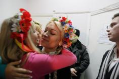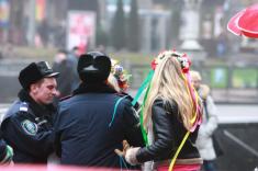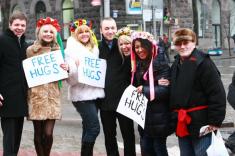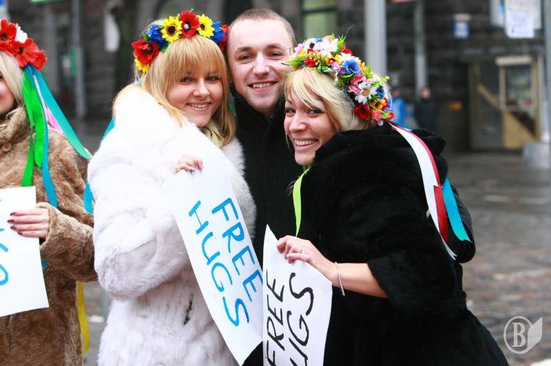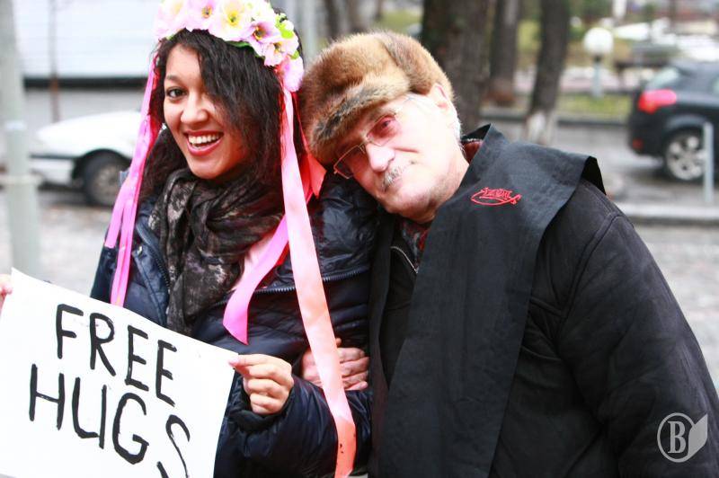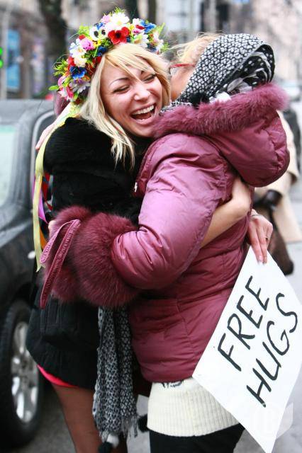 Полностью одетые активистки с плакатами «Free hugs» обнимались на центральной площади Киева.