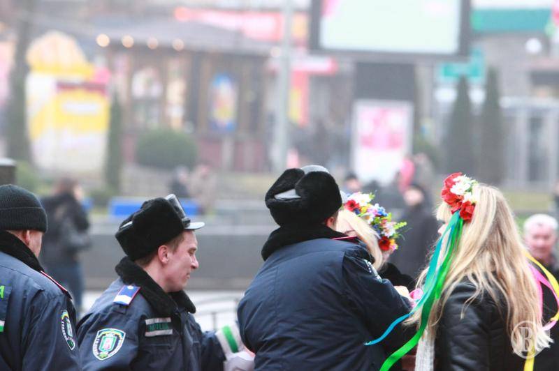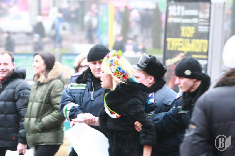Активистка FEMEN Инна Шевченко была задержана на Крещатике во время проведения совместного с журналом «What's on» фотопроекта, посвященного Международному дню объятий.