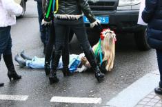 Когда Инну усадили в черный воронок, другая активистка FEMEN Александра Шевченко попыталась остановить ментовский произвол и легла под колеса милицейской машины. Сашу вытащили из-под «бобика» и оставили лежать на мокром асфальте.