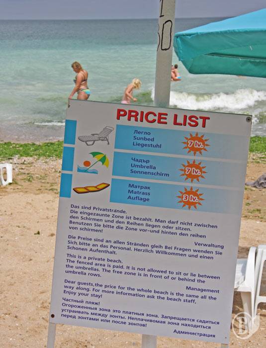 Там найбільше відпочиваючих з таких країн як наша, а також з Росії, Казахстану, і нинішніх росіян, які переїхали жити в Німеччину. Адже подивіться на фото ціни лежаків, матраців і парасоль на один день.