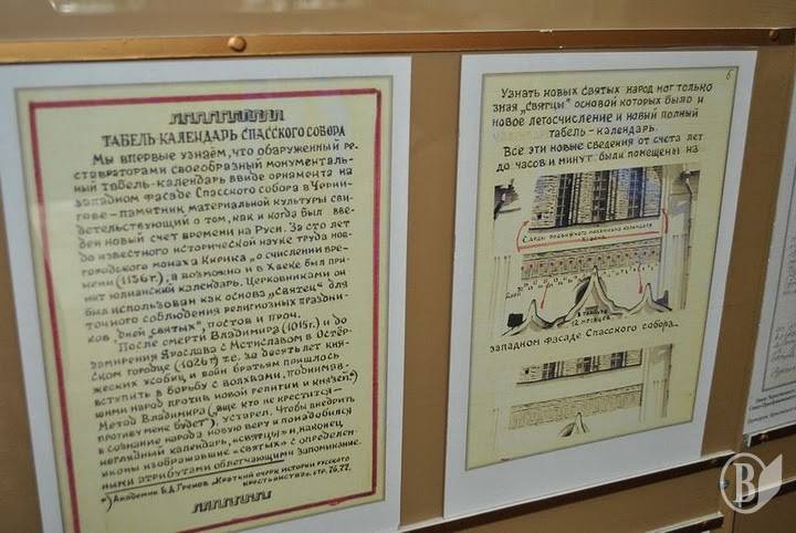 Зокрема, експонуються витяги із «Повісті минулих літ» про смерть великого князя Мстислава Володимировича з першою згадкою про Спасо-Преображенський собор та із «Патріаршого або Никонівського літопису» про смерть великих князів чернігівських Мстислава Володимировича, Святослава Ярославича, Гліба Святославича, Володимира Давидовича й митрополита Київського Костянтина та їхнє поховання в Спасо-Преображеньському соборі; витяги з праці Г. Милорадовича за 1890 рік «Описание Черниговских соборов Спасо-Преображенского и Борисоглебского»; донесення Чернігівської казенної палати до Чернігівської духовної консисторії з відомостями про виготовлення в 1793 – 1794 роках для Спасо-Преображенського собору нового іконостасу з царськими вратами та ікон; Погар на реставрацію Чернігівського Спасо-Преображенського собору (1786 рік), та інші документи та друковані видання.