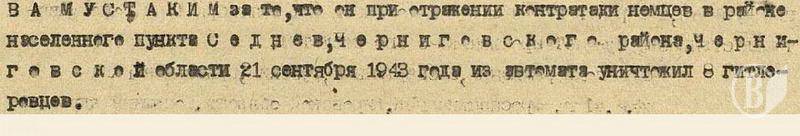 Из наградного листа о награждении орденом Отечественной войны І-й гв. лейтенанта, командира пулеметного взвода 32 гв.сп 12 гв.сд Чернявского Владимира Григорьевича (14.10.1943): «Тов. Чернявский в боях с 21 по 23.09.43 г. проявил образцы мужества и отваги. В одном из боев в районе рощи у Глебовских хуторов со своим взводом разгромил штаб немецкого саперного батальона и взял в плен командира батальона и начальника штаба. В этих боях он своим взводом уничтожил до 50 солдат и офицеров противника» (ЦАМО. - Ф. 33. - Оп. 686044. - Д. 1811).
