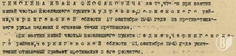 … командира отделения 1 роты противотанковых ружей гвардии сержанта Тимохина Ивана Феофановича: «за то, что он при взятии нашей частью населенного пункта Седнев... 21 сентября 1943 года уничтожил станковый пулемет противника с его расчетом»;