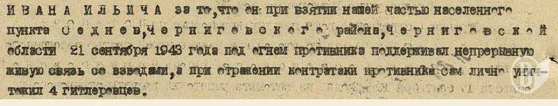 … стрелка 1 стрелковой роты гвардии красноармейца Чебыкина Ивана Ильича: «за то, что он при взятии... Седнев... 21 сентября 1943 года под огнем противника поддерживал непрерывную живую связь со взводами, а при отражении контратаки противника сам лично уничтожил 4 гитлеровцев» (ЦАМО. - Ф. 33. - Оп. 682526. - Д. 1761).
