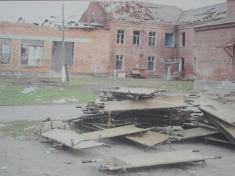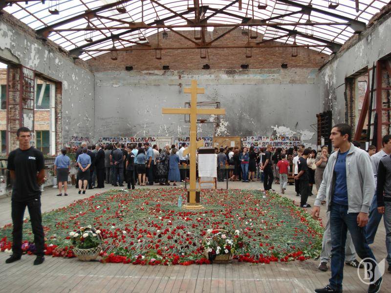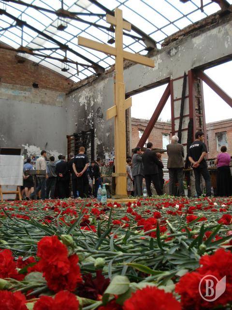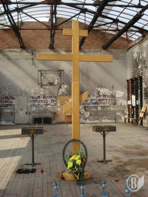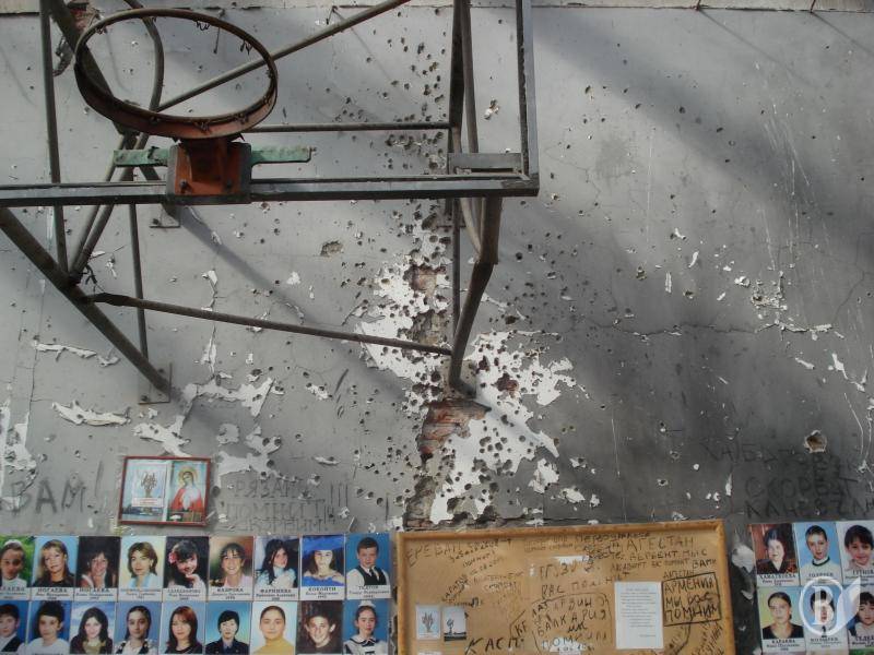 Залишивши наплічник на подвір’ї монастиря, я дійшов до школи №1. Епіцентр трагедії – спортзал – тепер накритий прозорим пластиковим дахом. На стінах – фотографії загиблих дітей, батьків, вчителів, "альфівців". У центрі залу встановлений великий дерев’яний поклінний хрест. Свічки, квіти, вінки, дитячі іграшки. Написи на стінах: "Скорбим вместе с вами. Нальчик", "«Альфа», «Вымпел»! Спасибо вам за наших детей!", "Моздок скорбит", "Рязань помнит. Скорбим"…А отодного із написів, що бачив у серпні 2005 року ("Путин, будь ты проклят, ты погубил наших детей!"), вже немає. Його, напевно, стерли напередодні приїзду в Беслан когось із російських високопосадовців. Коли вперше відвідав це страшне місце у 2005-му (менше року минуло від трагедії), по моїх щоках текли сльози. Скупі чоловічі сльози. Тепер їх не було, плакала вже душа…