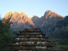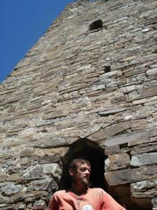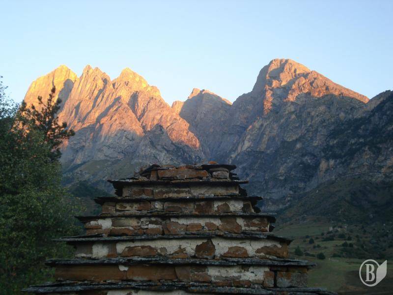 Наступного ранку, прокинувшись ще до сходу сонця (хотілося сфотографувати освітлені червоно-помаранчевим кольором гори), я вирішив дослідити баштовий комплекс Верхній Оздик. Перестрибнувши струмок, по ледь помітній стежці піднявся до бойових і житлових башт та склепів. Коли тут жили люди, це фактично був аул-фортеця. Інгушські бойові башти є, за великим рахунком, вершиною архітектурної і будівельної майстерності стародавнього населення краю. Вони вражають простотою форми, монументальністю і суворою витонченістю. Особливої величі їм надає пірамідально-ступінчатий дах. Заввишки бойові башти мають 27-29 метрів, а співвідношення висоти до основи – 10:1. Як правило, вони п’ятиповерхові, хоча трапляються й у чотири або шість поверхів. Перший поверх зазвичай слугував темницею для полонених, там же зберігалося зерно в спеціальному кутовому кам’яному "мішку". На другому поверсі знаходилися захисники і стража під час облоги, оскільки вхід у бойову башту був лише тут. Третій поверх займали сім’ї захисників, всі верхні поверхи – воїни і вартові. Своєрідною особливістю багатьох інгушських (а також і чеченських і грузинських) бойових башт є "машикулі" - маленькі захисні балкончики на верхньому поверсі, які разом з бійницями служили цілям ефективної оборони. Ще одна особливість – наскрізні великі хрести, які робилися майже на всіх боках верхньої частини башт (так звані "хрести Голгофи"). Дослідники пов’язують їх із впливом сусідньої православної Грузії (достеменно відомо, що іслам в Інгушетії остаточно утвердився лише в середині ХІХ століття).