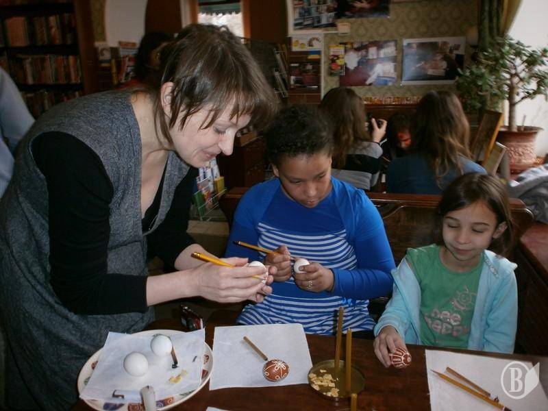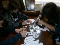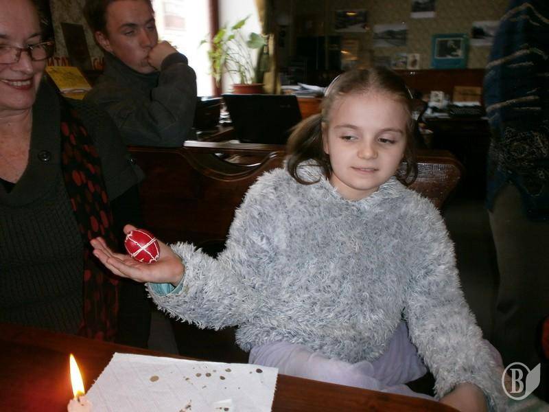 Тетяна Жогалко, голова міської ГО ССУ розповіла про традиції розпису писанок, про знаки і символи, які наносяться на писанки. Діти і вчителіо знайомились з невеличкою виставкою з галереї «Круті Сходи» – писанки, яйця з кераміки і скла, розписні яйця, а також витинанками створеними дітьми з громадської організації «Шанс». Французькі гості мали змогу не тільки передивитись витинанки, а й навчитися техніці витинанок.