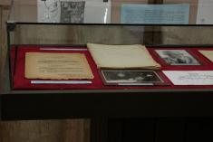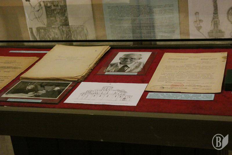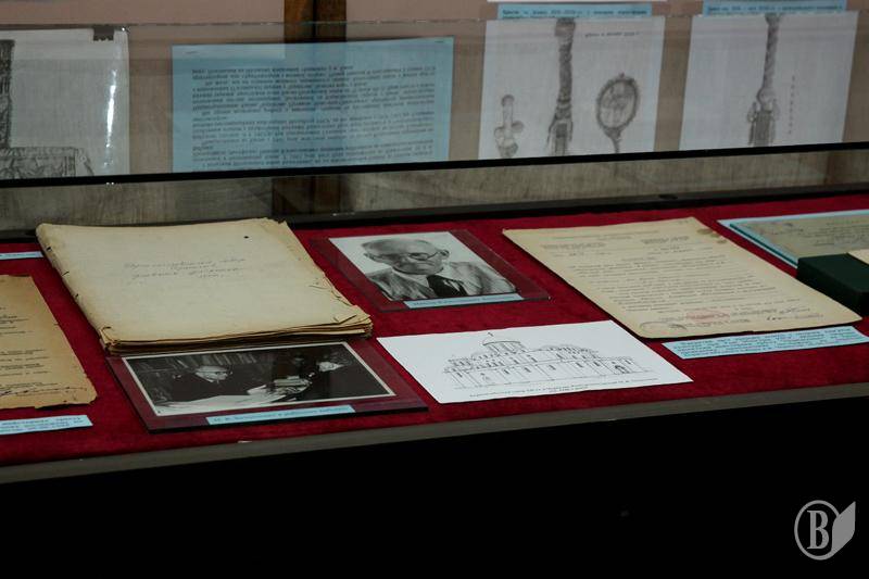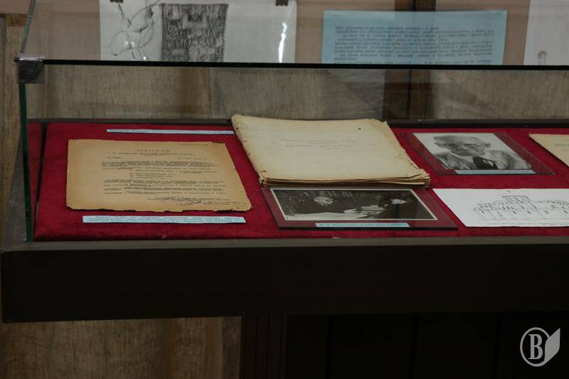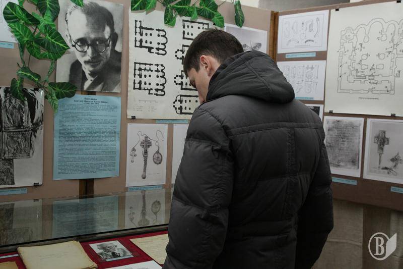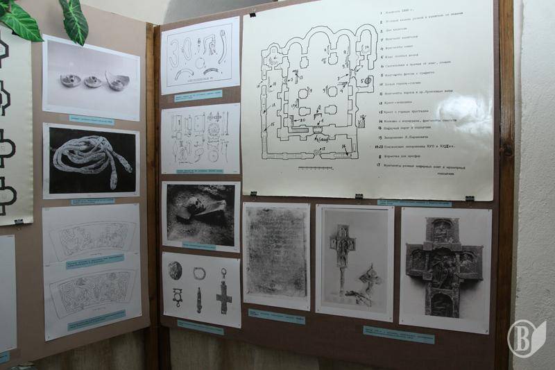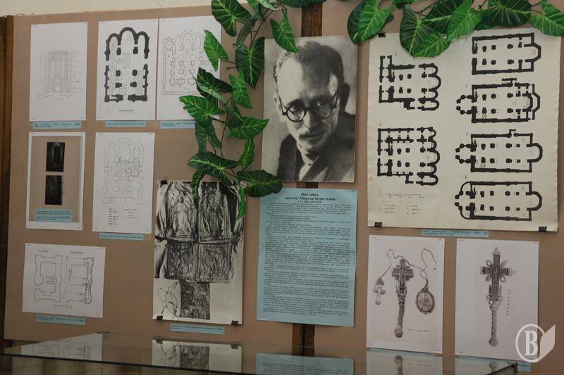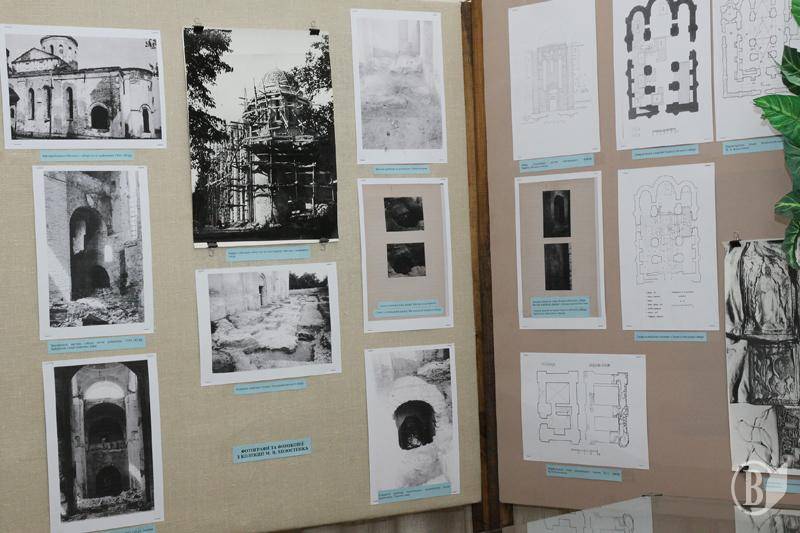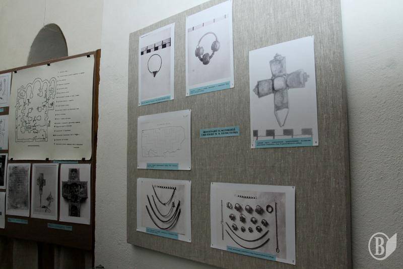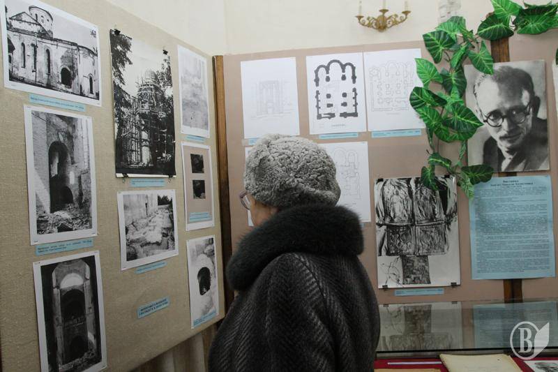 На виставці представлені матеріали з архіву Миколи Холостенка. Це його щоденники досліджень, різні документи, листи. Також цінні фото з архіву – стан пам’ятки Борисоглібського собору зруйнованого після війни, всі етапи реставрації, цінні експонати. На особливу увага заслуговує клад срібних і золотих речей, який знайшли у південній каплиці з південної сторони собору.