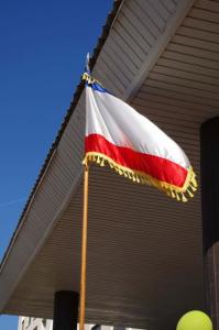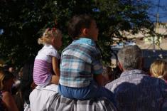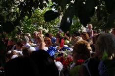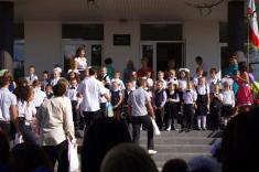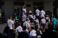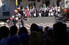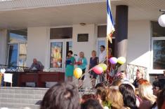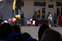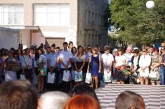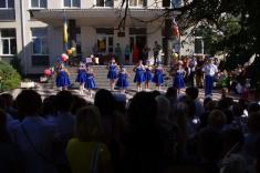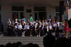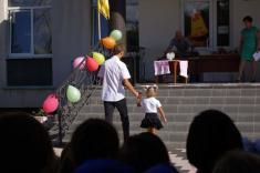 Первый звонок прозвучал по хорошей традиции от первоклассницы, которую нес на своем мужественном плече выпускник. Символ праздника все время торжественно стоял на вышитом полотенце, одетый в белый бант.